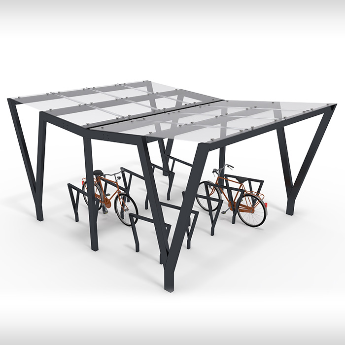 Wizualizacja wiaty GRJ_D_M2 ze stojakami rowerowymi BR.10 oraz BR.130