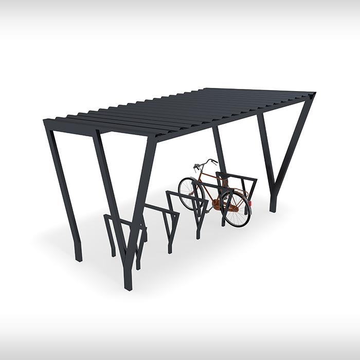 Wizualizacja wiaty GRJ_D_M1 ze stojakami rowerowymi BR.10 oraz BR.130